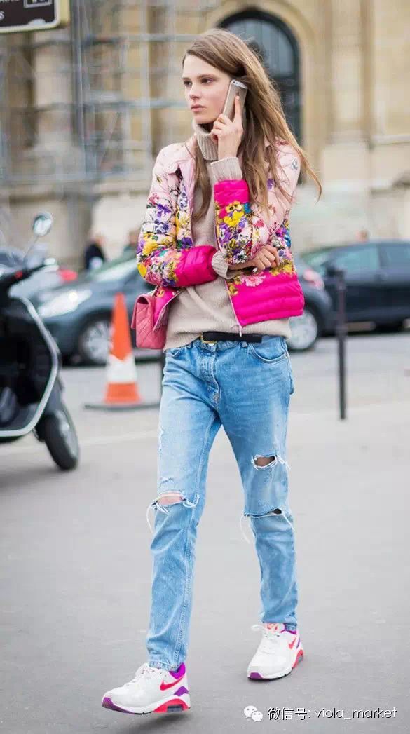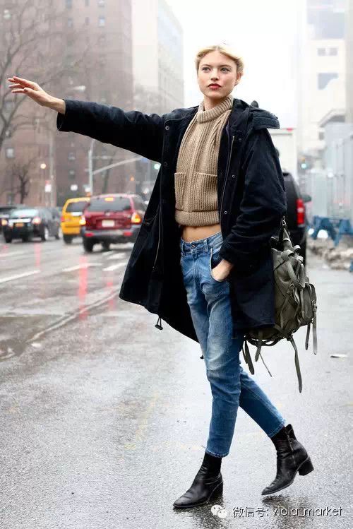 较宽大膨胀的款式可以考虑在层次上做些文章,比如内里穿搭小外套,或者将牛仔裤卷起,制造丰富的多层次。