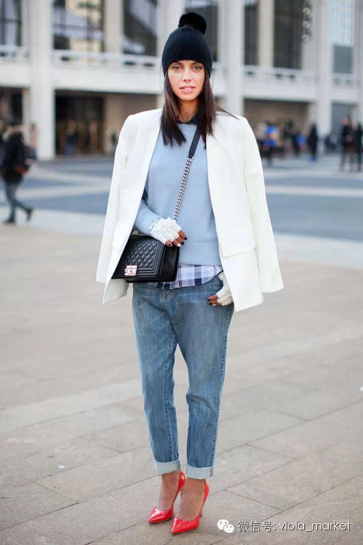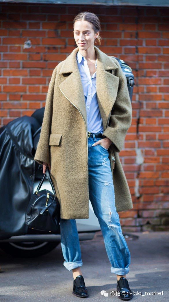 在Oversized大衣篇,我们也曾经提到过将裤脚卷起的穿法,这种方法不论是宽松款牛仔,还是男朋友款,亦或是紧身小脚款,都可以尝试,鞋子的配搭也可以多样,运动鞋,裸靴,或者浅口鞋都能穿出时髦感。