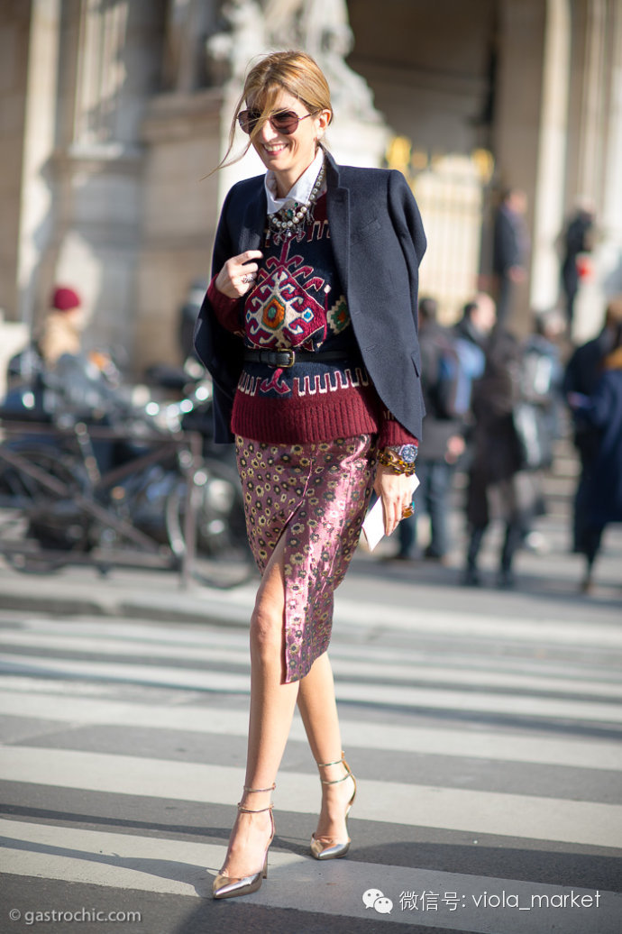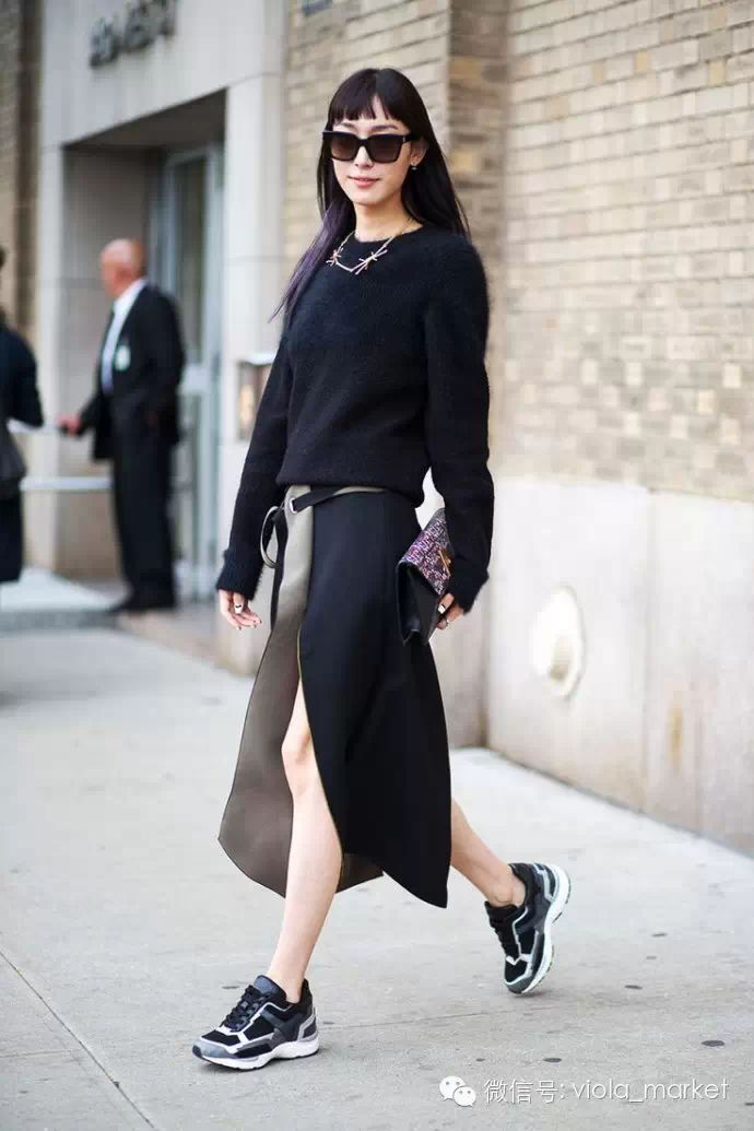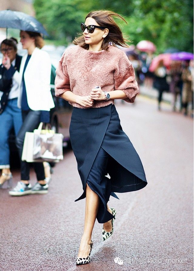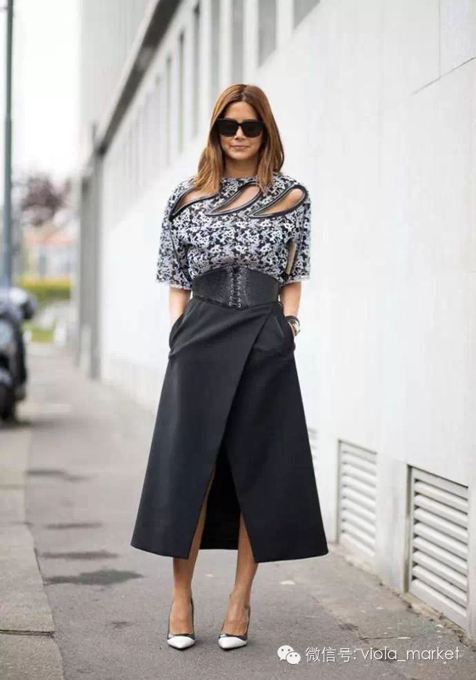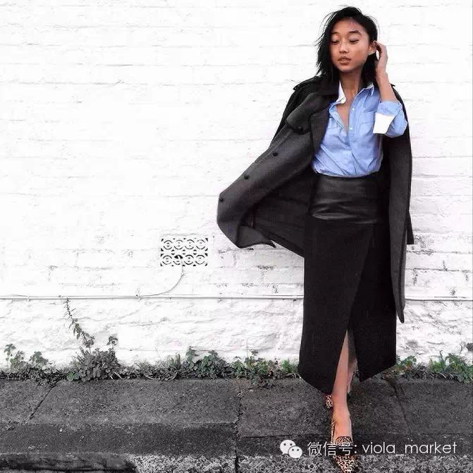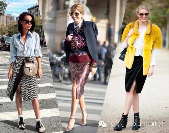 随着裙长加长,开叉也越来越深,气势也越来越强。搭配技巧上,不论衬衫或毛衫,保证上短下长的比例至关重要。