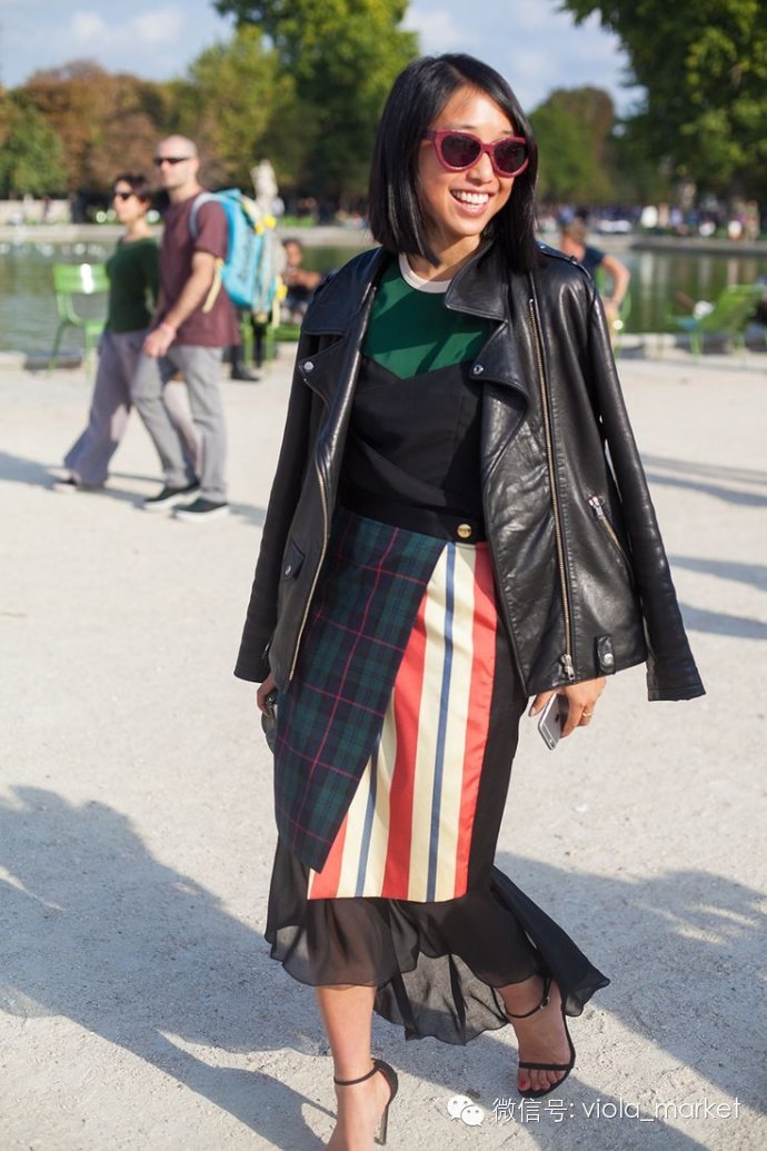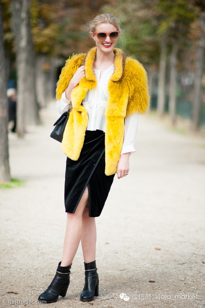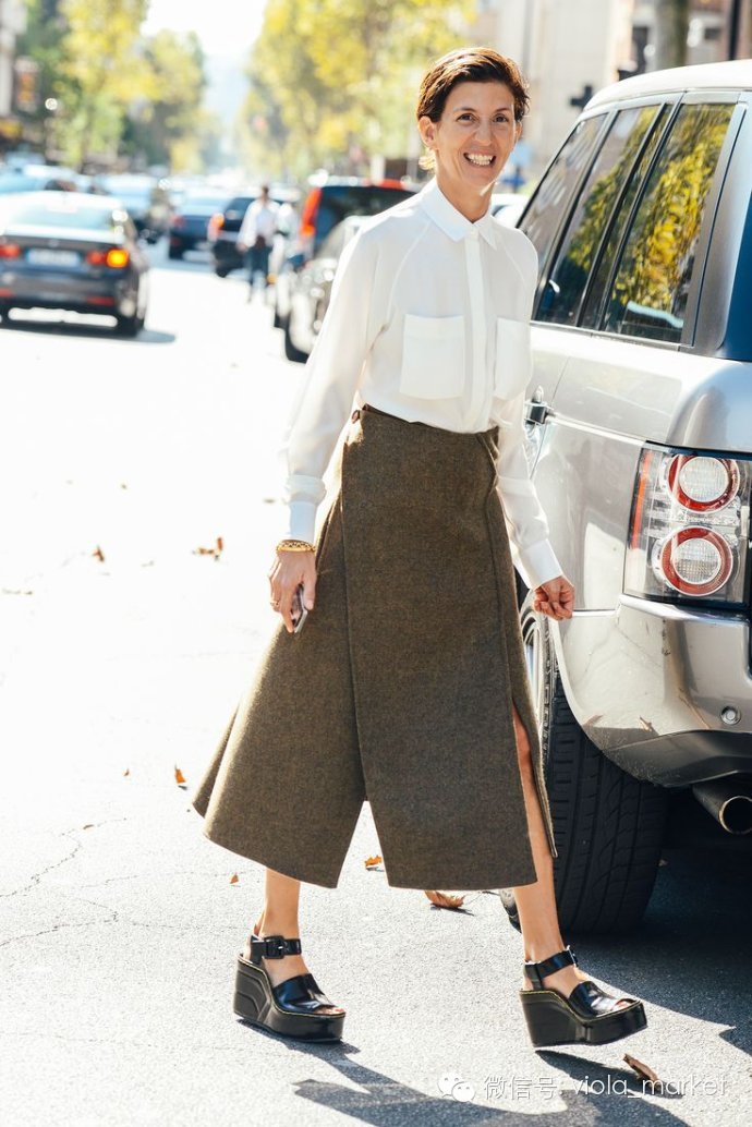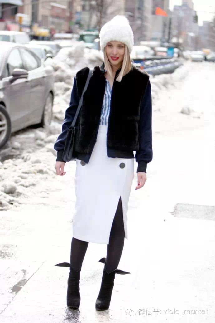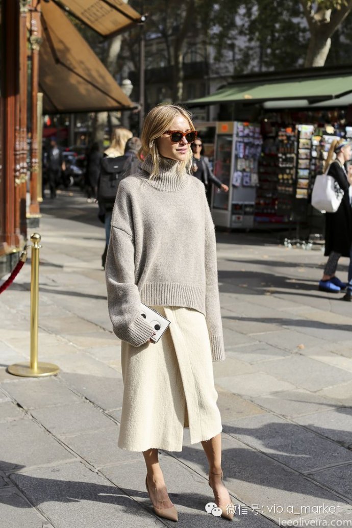 随着裙长加长,开叉也越来越深,气势也越来越强。搭配技巧上,不论衬衫或毛衫,保证上短下长的比例至关重要。