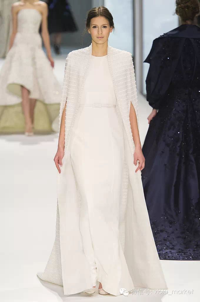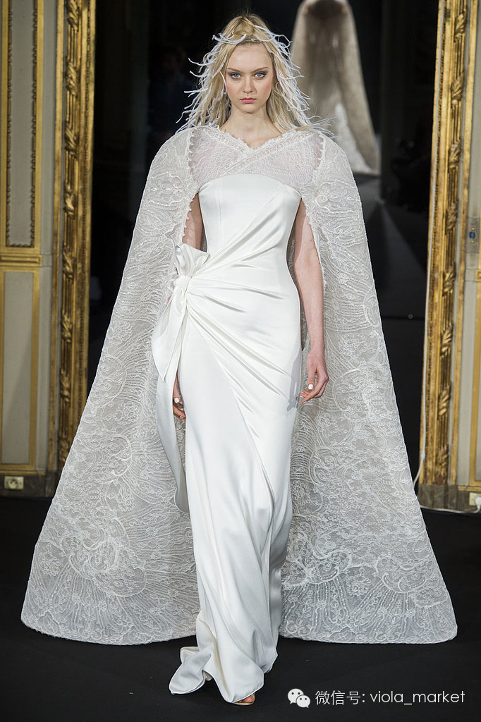 披肩元素的火爆,已然渗透入高级定制的行列,白色的披肩结合蕾丝与闪亮的水钻,有着白雪王后一样的高傲气场。
