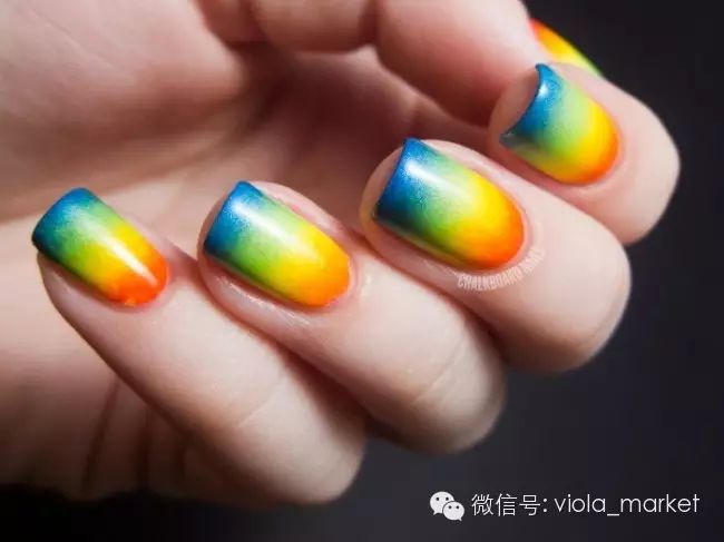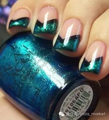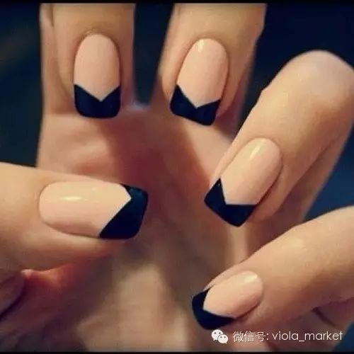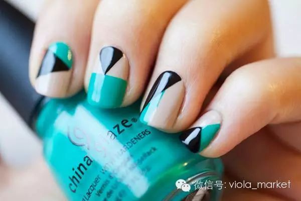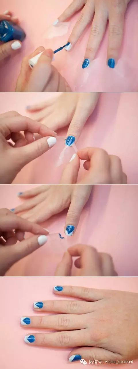 如果想用两个颜色的指甲油做造型的话,可以用胶带剪出尖口然后贴在指甲上在上另外一层颜色,注意中间的部分要来回擦个一两次颜色才会均匀。