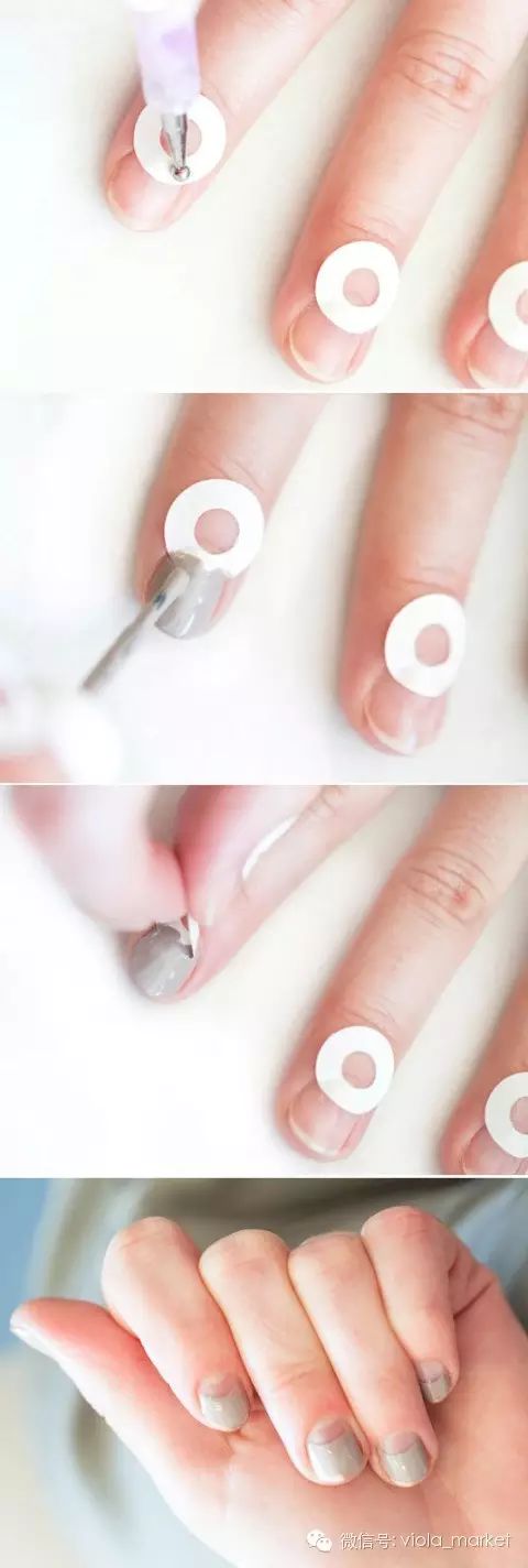 利用夹页笔记本圆形保护贴来画出漂亮的圆弧形,随着摆放高低能够做出许多不同层次,像是摆在指尖处就能画出漂亮的法式指甲,也能利用橡皮筋缠绕的角度在指尖处呈现圆弧状。