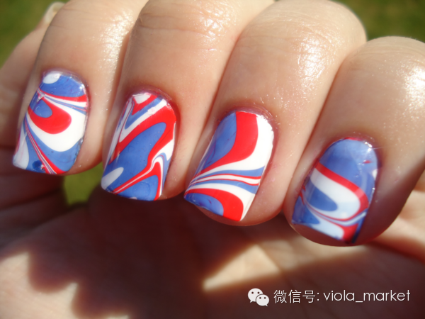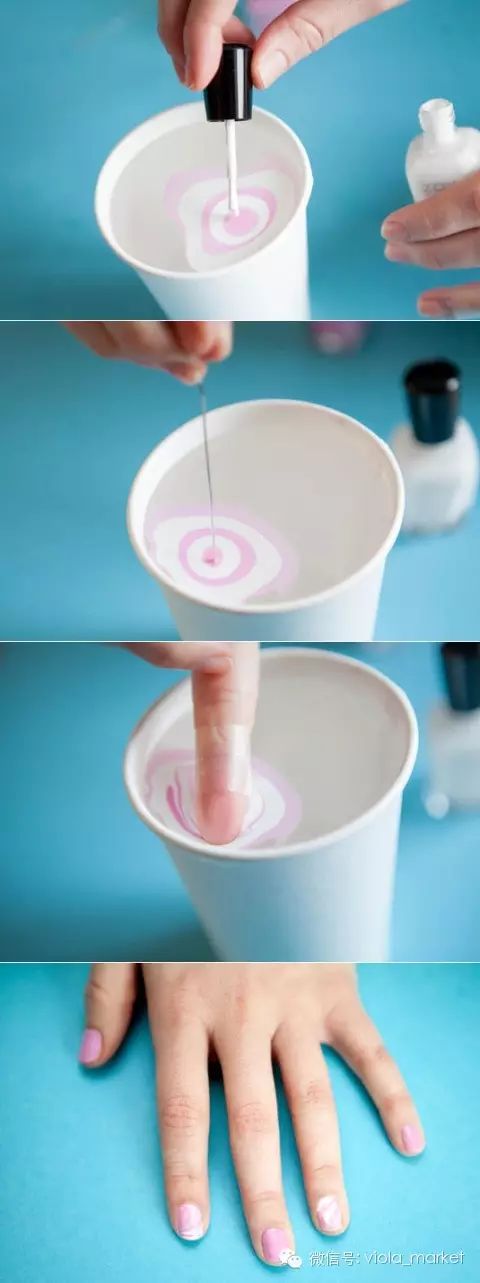 首先为了不弄脏你的手你需要用胶带绕手指粘贴,再来准备小纸杯装满约九成的水,接着滴入你想要调的大理石花纹颜色,注意用量不要过多以免颜色阶层不明显。再来用针或者是牙签制造出波纹最后指甲面向下沾取,最后撕掉胶带泡冷水等凝固即可。