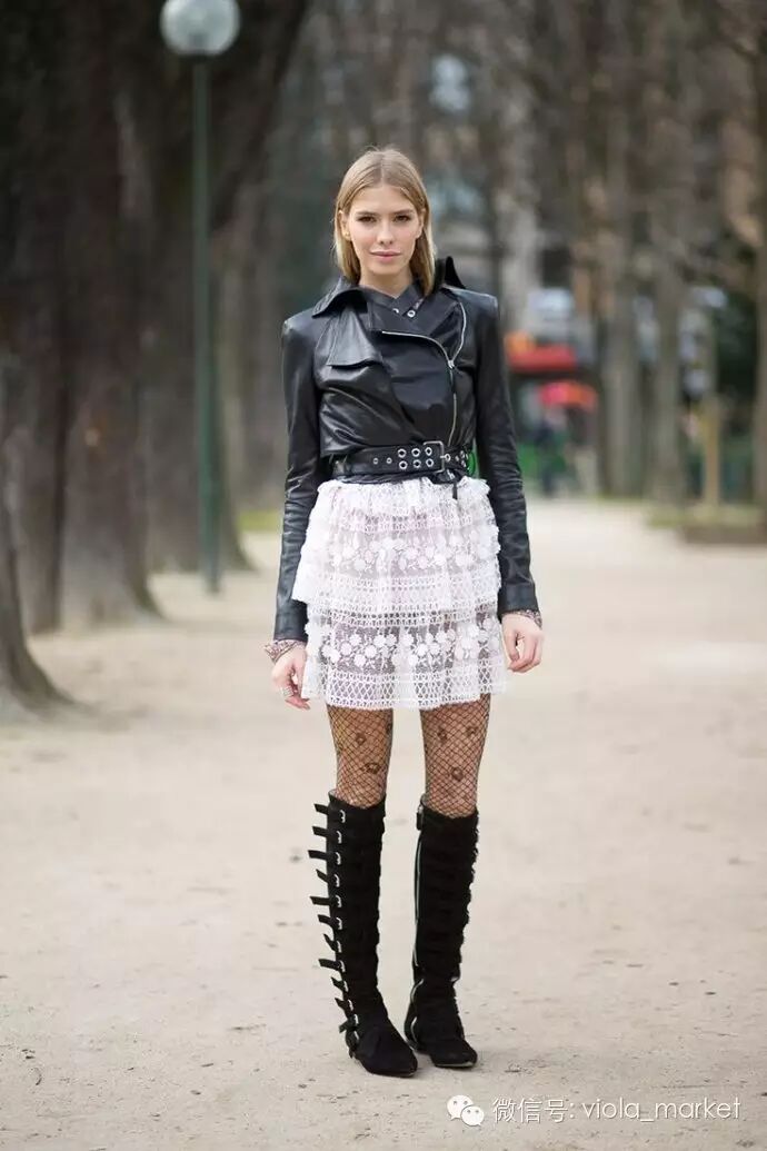 时尚博主Camille Charriere的这身酷搭,告诉我们,迷你裙在你搭配飞行员夹克和及膝靴的时候,连裤袜就没有必要了。