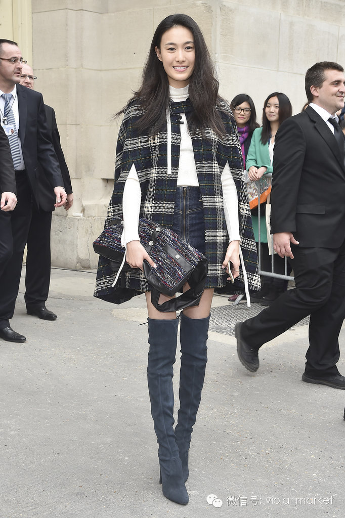 美丽的秦舒培英伦格子披风和麂皮及膝靴,一派甜甜的School girl味道。