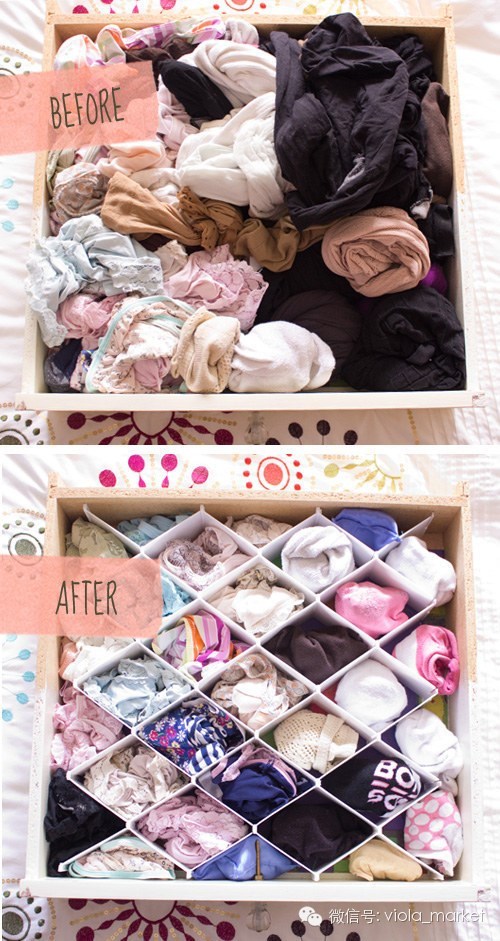 *抽屉里的空间可以根据需要用各类大大小小的格子、盒子分割空间,最好放分类放袜子、内衣、内裤、钱包、饰品。