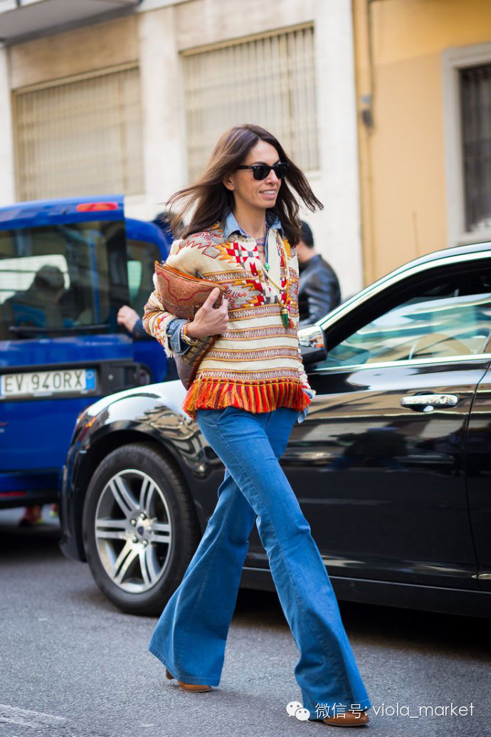 波西米亚风也是70年代另一代表风格,因此与喇叭裤搭配也是相得益彰的。
