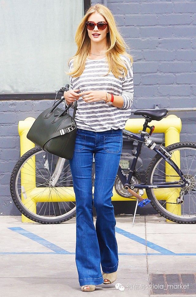 紧身高领T或休闲短袖T以及百搭条纹T与喇叭裤搭配,仍是那种轻松简洁的调调,喜欢低调随性的妹子一样可以尝试。