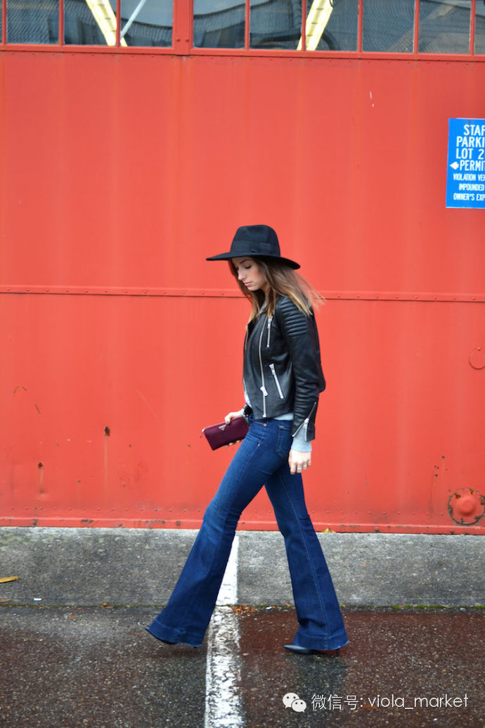 除了复古搭配方式,与现在流行的经典单品搭配,也有出其不意收获混搭新风味。例如酷酷的机车皮夹克,和今年特别火的披风,或者再加上一顶宽边帽。看腻了机车外套配紧身裤,不妨可以换换口味试试喇叭裤。