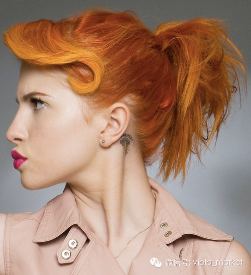 充满活力的红发摇滚女歌手Hayley Williams耳后有一个闪电和乌云的小纹身。