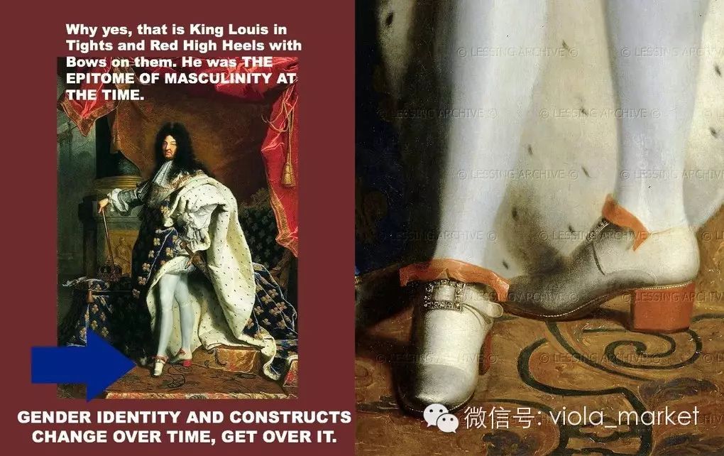 16世纪最早将高跟鞋引入欧洲的是波斯人的 6 英寸骑马鞋,男人穿高跟鞋就纯粹是为了实用——更方便骑上马背,蹬上马鞍。西欧贵族马上喜欢上了这种波斯风格的鞋子,并让高跟鞋长到了 20 英寸,一夜之间,高跟鞋成了体现男性阳刚、强劲外表的唯一选择。另外,穿的越高越能显示社会地位。https://mmbiz.qlogo.cn/mmbiz/QOvLWJ6QkABvZnZ2TI3icmGicICpMJWWYakSsI82ibW8do8tfpenjf5QjOHfWgcHCgFOwQsMsJCENnzFwoeUY5HLg/0?wx_fmt=jpeg