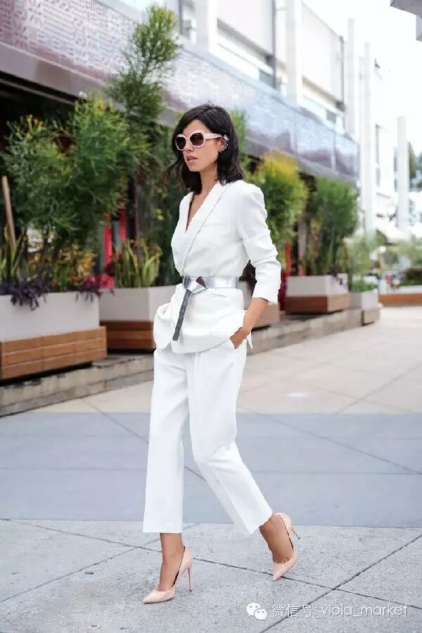 大多数妹子还是身材偏娇小的,因此白色窄脚西裤最好还是配上一双细细的高跟鞋为最佳,想要在办公室里来点气场,西服外套就要配起来了。