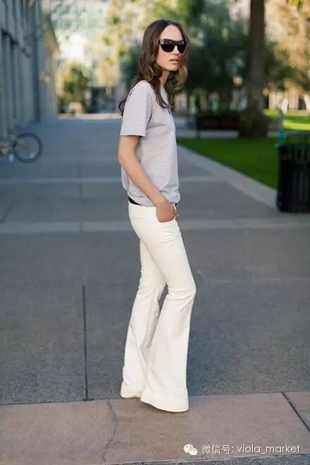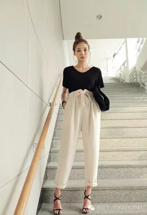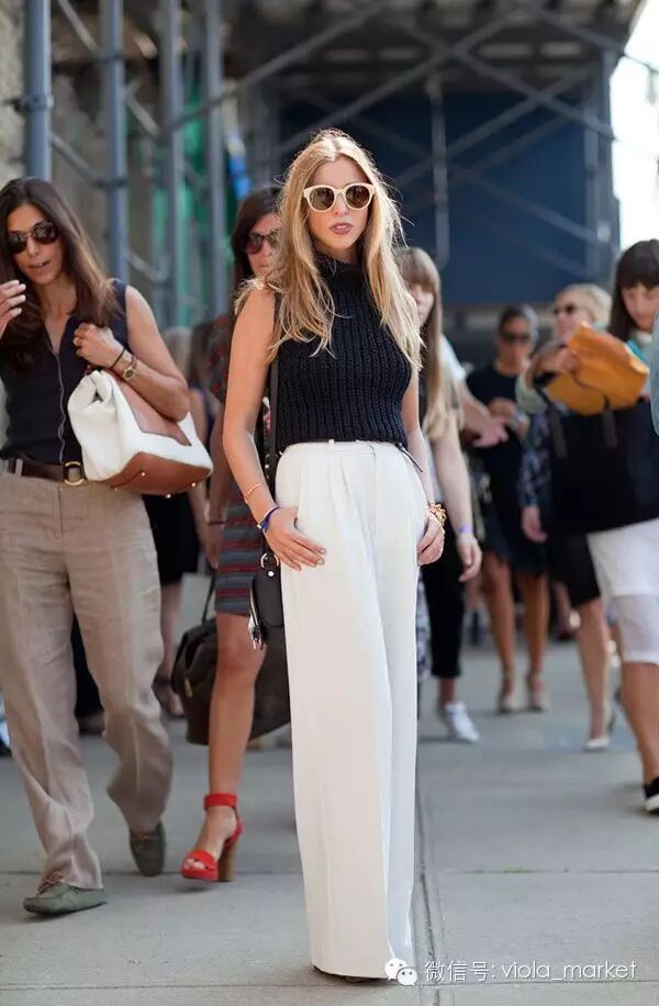 阔脚裤相当的能放松心情,加上一件短上衣,无限拉长下半身,再穿一双厚底鞋或高跟鞋,走起路来轻盈带风,怎能不让人有好心情。