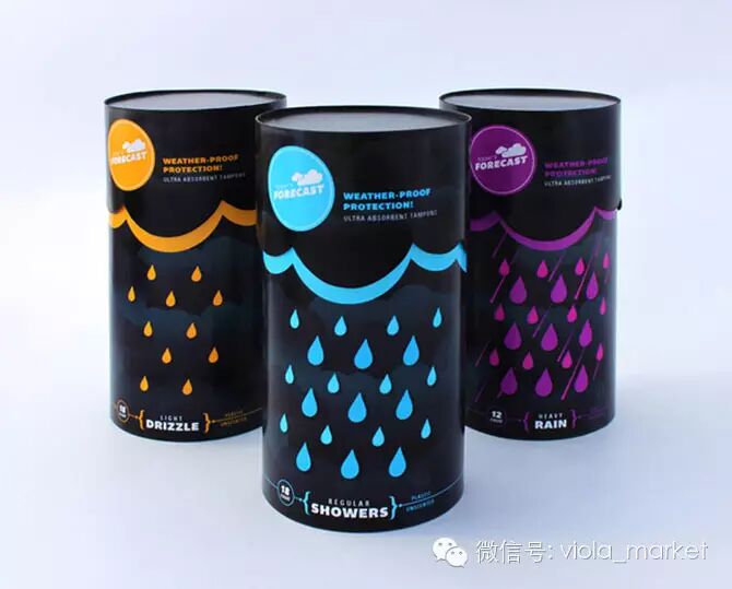 Today’s Forecast以一个创新的概念去比喻女性的经期,月经的流量就像降雨量一样,因此整个包装都以可爱的雨云和雨水作主题,以Heavy Rain、Regular Showers和Light Drizzle去分辨月经流量,而且每个独立包装的卫生棉条亦设计得像一把雨伞,非常可爱。有了它们,下雨那几天,心情还会low么?