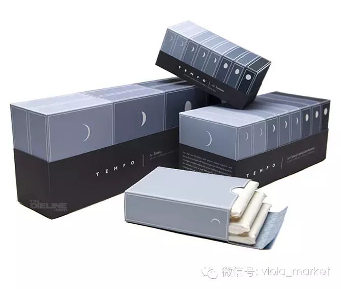 The Dieline Media设计了这款以月亮盈亏去作月经比喻的卫生巾,简约设计中带点文艺气息,每个纸盒上都印有不同状态的月亮让人分辨出不同流量的卫生巾,拿取适合不同日子的卫生巾。