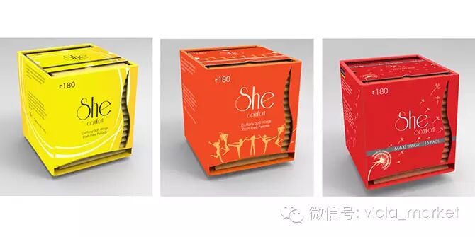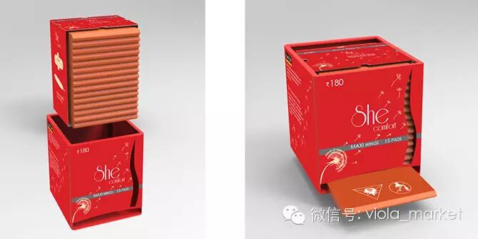 也是由3个学生设计的She卫生巾包装采用了亮眼的红、橙和黄色作主色,除了抢眼外,设计方便之处是以座枱式的盒子为主体,在盒子底部有一开口方便拿取卫生巾,而且用完后只需更换内里的替换装,大大减少无谓的包装。每次抽取的时候有没有在抽巧克力的感觉?心情立刻大好吧!