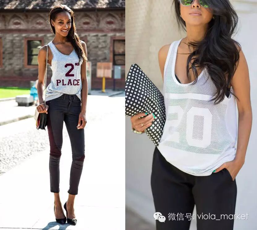带有球衣式的号码或者条纹设计的背心,搭配运动鞋,今年特别受欢迎。更多运动衫搭配点击这里