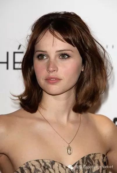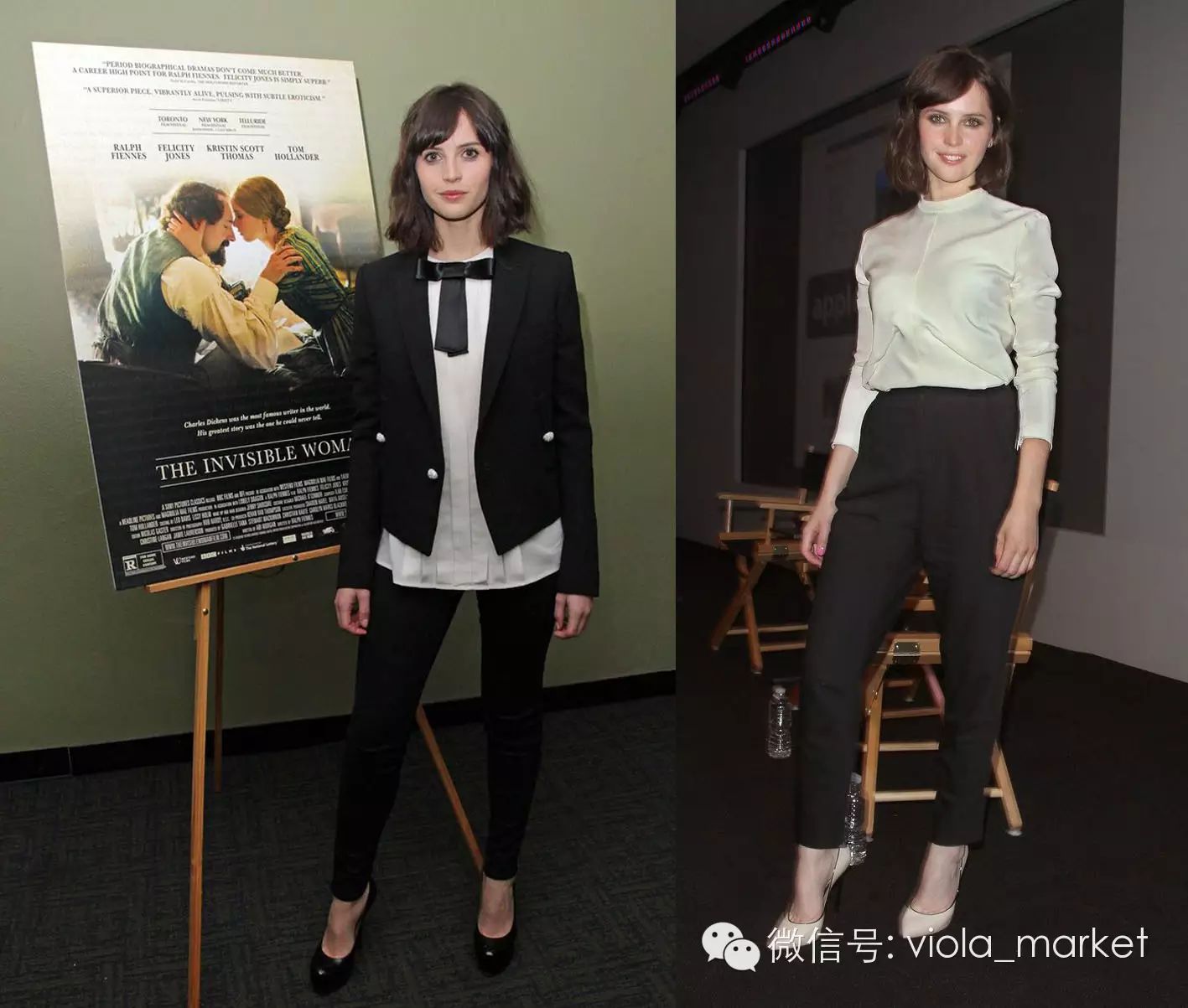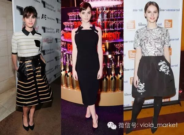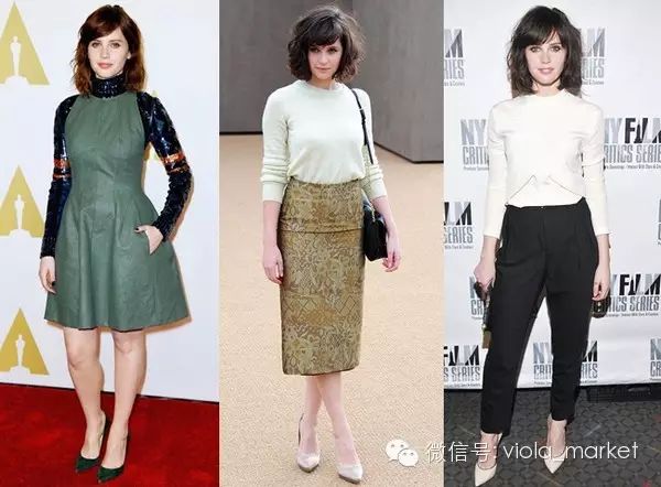 有着清新邻家感的Felicity Jones,招牌的门牙,中长度的发型,卷度自然,偏分短刘海,特殊迷人的气质总是能抓住所有的目光。自然垂放头发时,浪漫甜美;马尾造型时,带有清新知性的氛围。出席活动时常以及膝裙作为重点单品;红毯上则是常以长礼服出现。在私下穿搭方面则是以休闲、舒适为主,并以平底鞋作为选择,邻家女孩的亲近感。