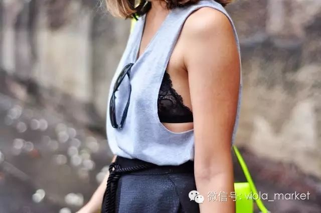 在上周的背心穿搭里,我们就提到了欧美这两年特别流行的两侧露很多的宽松背心。旧式搭法恐怕就是短版吊带或抹胸,不出错也不出彩。换一件比基尼式蕾丝Bra吧,精致,层次,优雅尽收衣内。