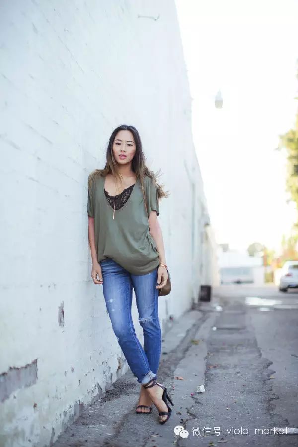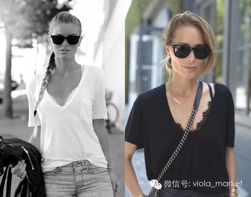 尽管今年流行高领和小领口的T恤,但大领口的中性T仍是搭配牛仔裤的最佳单品之一。以往可能很多人对大领口的露是比较头疼的,而内搭抹胸多少又会有些笨拙,如果换成有蕾丝边的全罩杯Bra则会收获意想不到的效果。