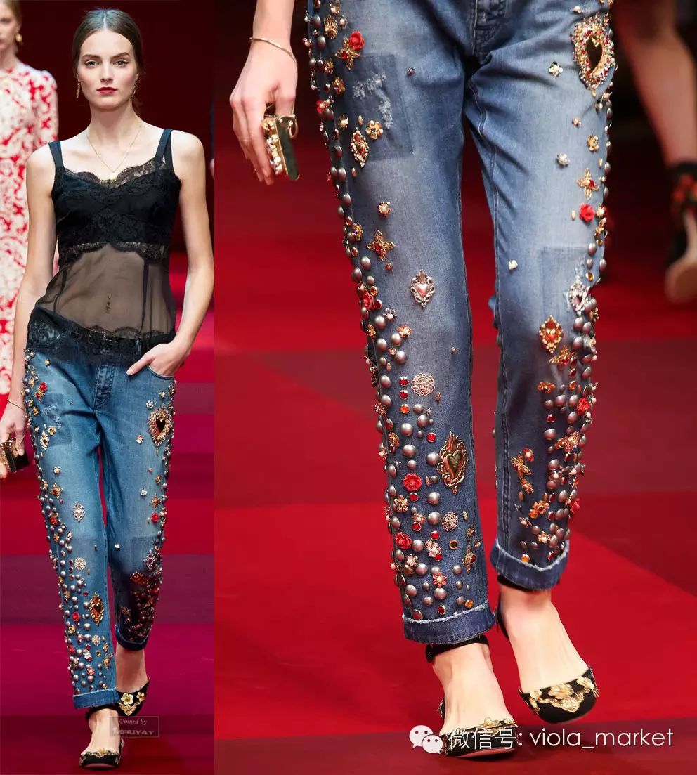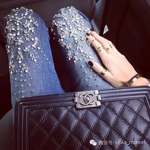 精品牛仔裤上的珠花、拼贴、刺绣工艺,往往和高级定制一样,由专门的工坊工匠们手工完成。设计师们会在精品牛仔裤上体验更多的尝试,独特的剪裁、细部的设计,都凝聚了设计师的才华。