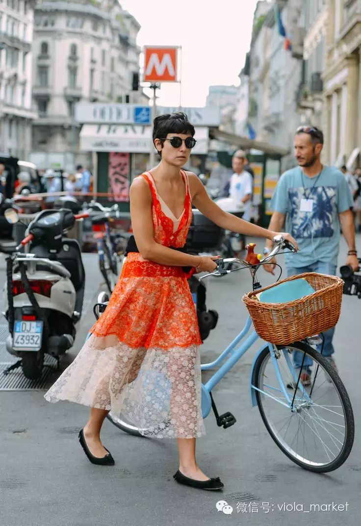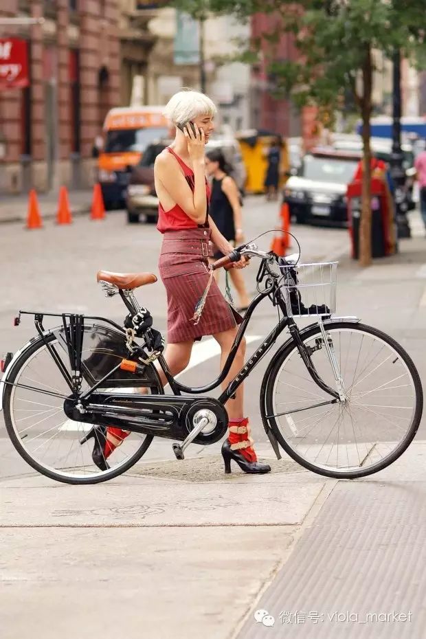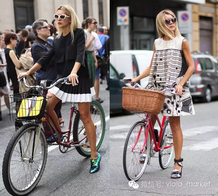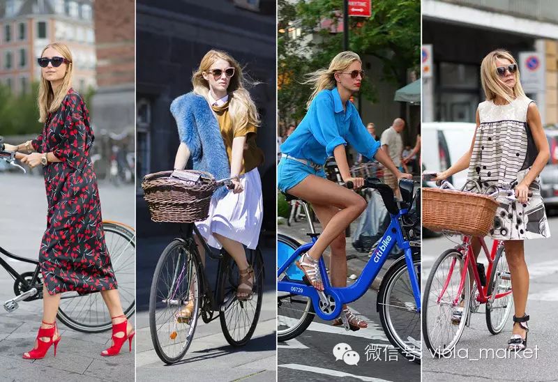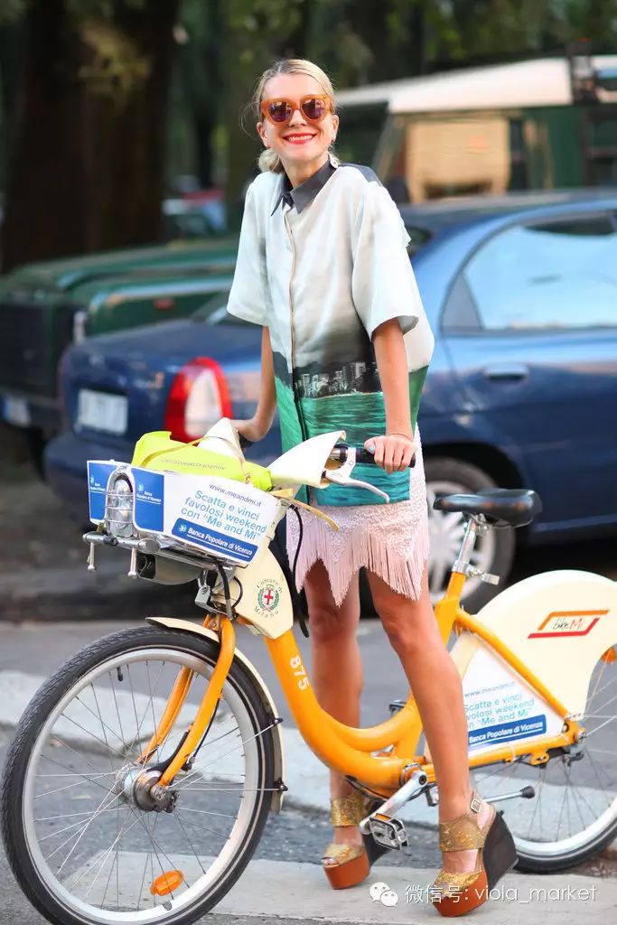 时尚编辑、博主们还有那些街拍红人们,纷纷携着单车来抢镜,就算是精致的连衣裙,纤细的高跟鞋也不能阻挡她们骑上单车摆pose。