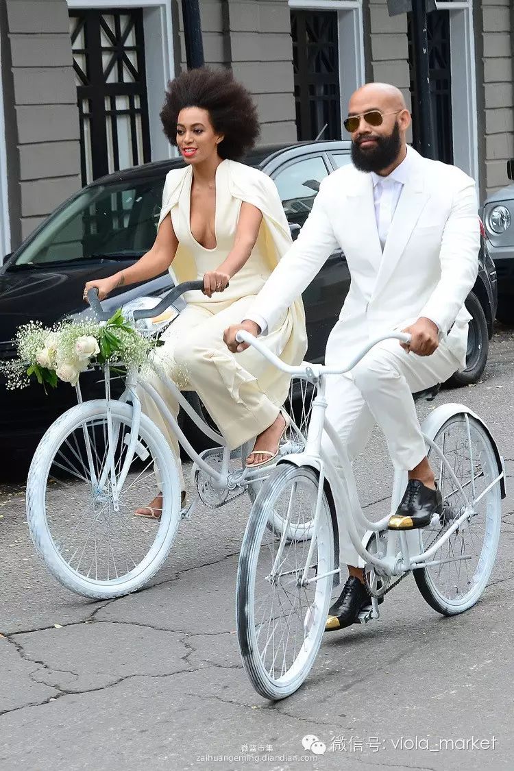 Solange Knowles对单车的热爱度也是无人能及的,没有人会穿着婚纱骑着单车去教堂来完成自己的婚礼,而她就这样做了。(不过她的婚纱可是连身裤喔~~婚纱本身就已经另类的不得了了)