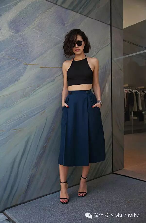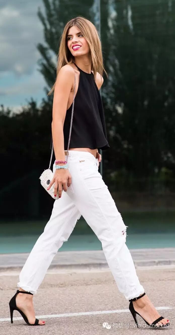 如果不想露太多腰部,可以选择下摆打开削肩小衫。少一些紧身款的强势和成熟,多一些女性的玲珑和浪漫。同样也是适合搭配各类高腰下身,例如复古的mother牛仔裤,短裙、短裤,还有今夏最流行的阔脚裤。