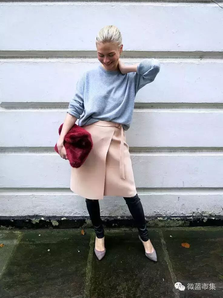 可以搭配宽松毛衫,但毛衫长度最好不要超过臀部。