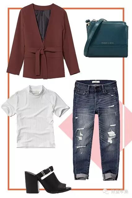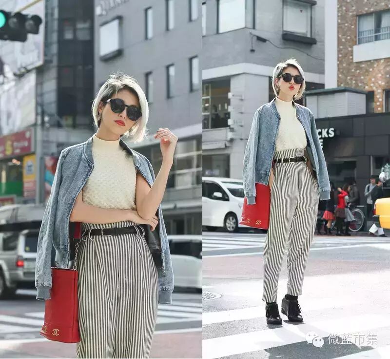 将T恤扎进腰里,或者搭配短夹克,都是拉长上下身比例的好方法。