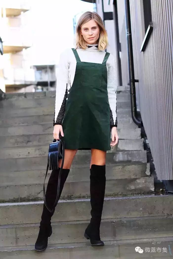 蓝松个人特别喜欢这套搭配,高领兔绒毛衫感觉非常的温暖,长款背带裙,拉长身材比例,最后再配上一双厚底鞋,即使小个子,也能穿出高挑气质。