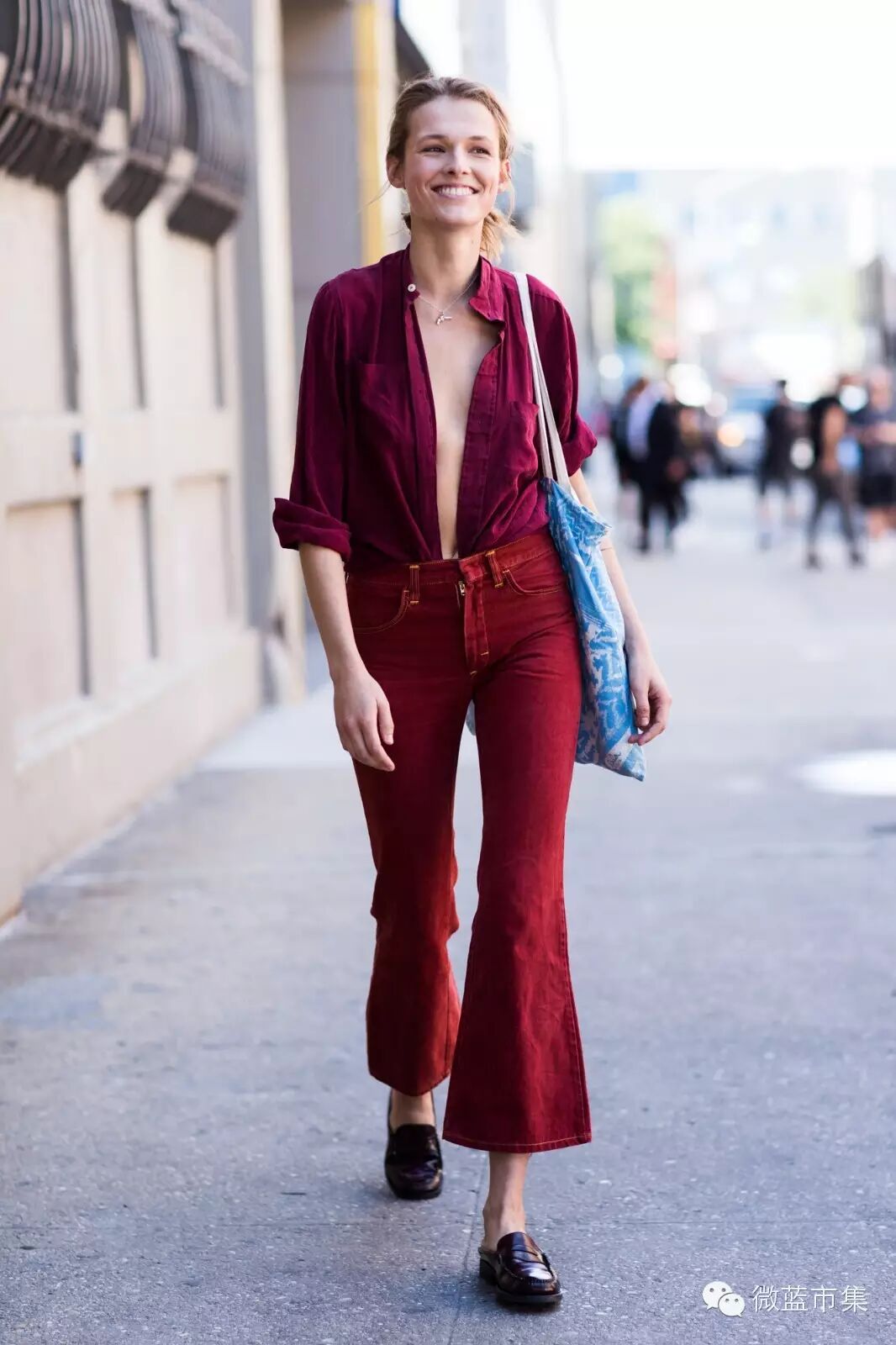 看这红配红,中国人那么喜欢红色,恐怕没人会这样穿红色。还有这深V整的,那么休闲又那么性感,国内虽然较难学起来,但衬衫 九分喇叭 平底乐福鞋的搭配还是可以借鉴的。
