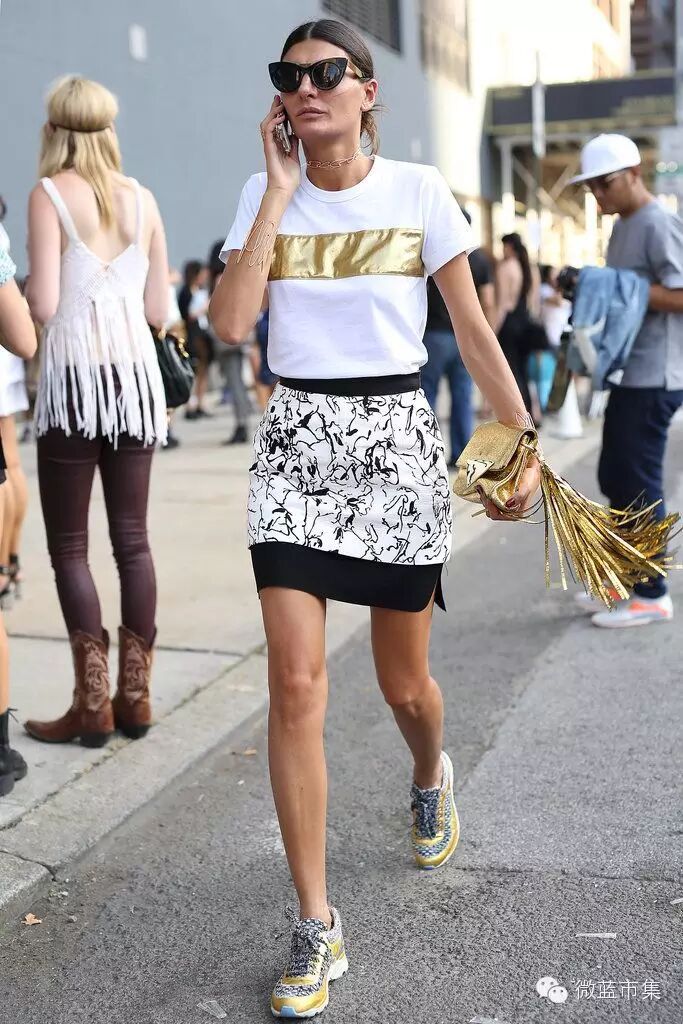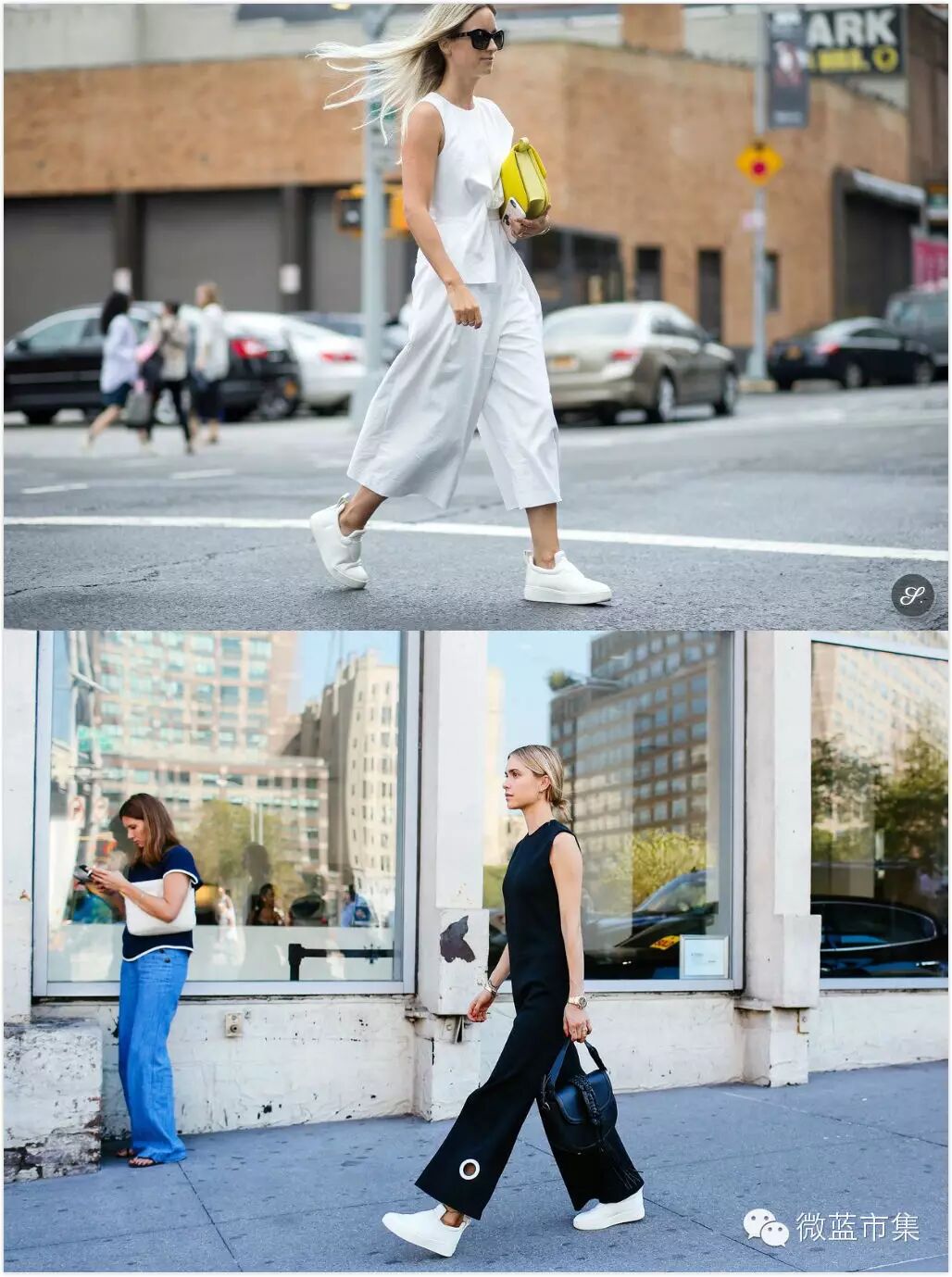 纯黑和纯白,既可以一身黑或白出现,也可以穿得花枝招展最后用一双极简的球鞋来平衡。像下图黑白无袖上装和阔腿裤,加一双连 logo 都不带的球鞋就很不错。