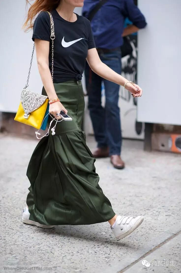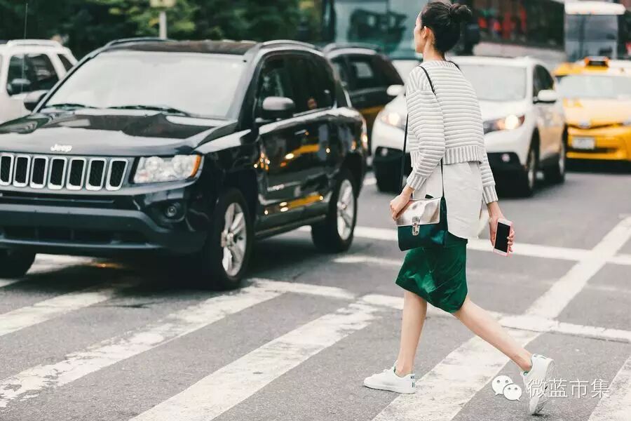 秀场外简直让 Stan Smith 称王称霸,这双后面的绿标和绿裙子、绿包袋作细小的点缀还挺妙: