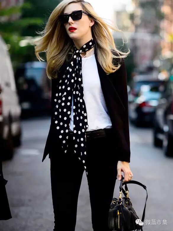当然这种系法最适用情境就是衬衫。或单穿衬衫,或加上外套,抑或是衬衫领的连衣裙,只要有衬衫领,那便可以系起来,甚至还可以配上一个vintage的丝巾扣,效果更到位。
