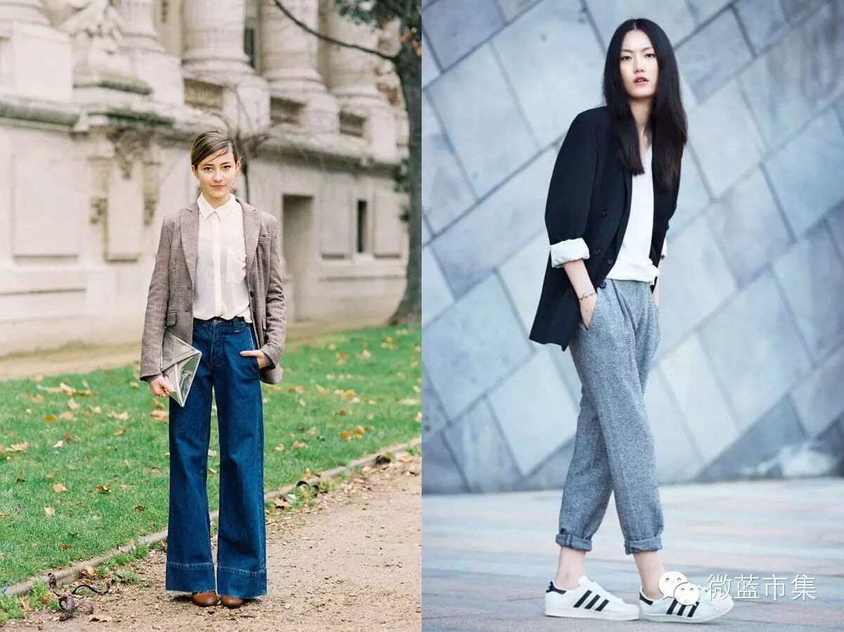 ↑牛仔阔腿裤和缩口阔腿裤也极具休闲学院风