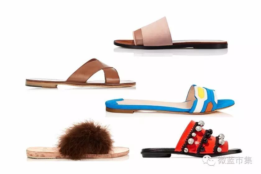 拖鞋式的凉鞋,逛街、high tea,又或者穿去海滩或游船河都同样适合,一穿即可出门,懒人必备!款式上有很多变化,包括是麖皮、皮革面料,缀毛毛球或闪石等。