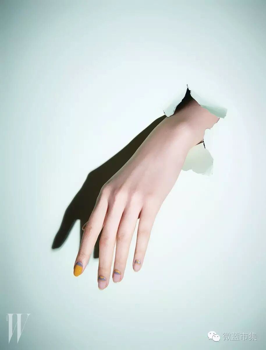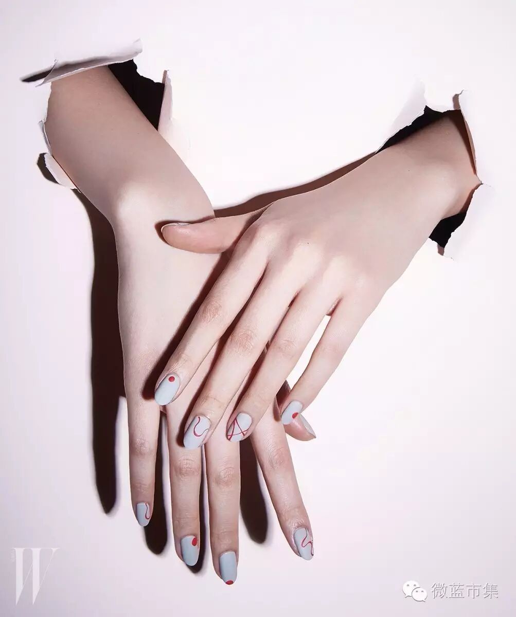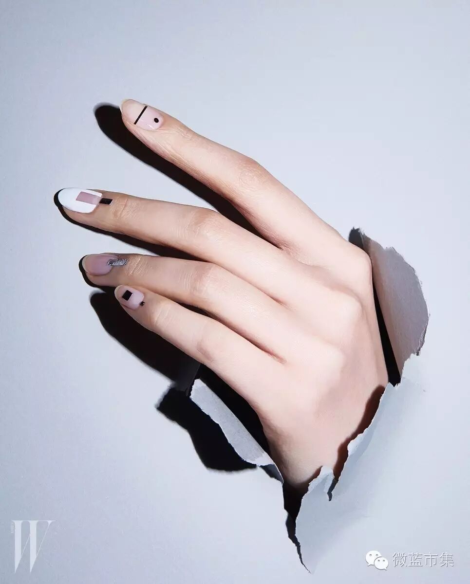 原则是5个手指都画相同几何图形,然后每个手指利用点、线、面的组合,画出完全不同的5种构成,有创意,有看点,别致又极简,图案延伸到皮肤上,让指彩不再只是指甲的事。(这其实很难保持)