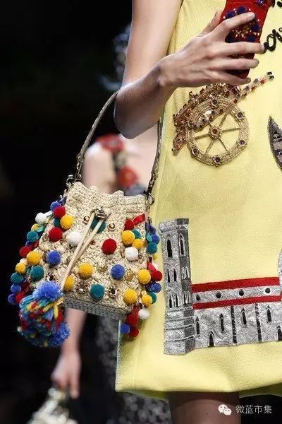 & Gabbana以墨西哥文化素材为主轴,以流苏、刺绣、彩色小球加上镜面,推出一系列充满南美墨西哥色彩的服装。运用单色系的服装使鲜艳的小球配件更加抢眼,却不显复杂,甚至配上丹宁或是强调女性腰线剪裁的套装,增加了俏皮感。Pom