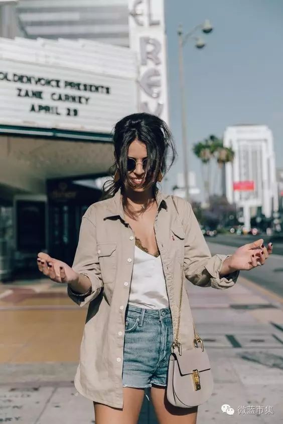 ↓牛仔短裤+缎面蕾丝吊带背心+棉质衬衫,非常时髦的穿法,博主们最爱睡衣风~
