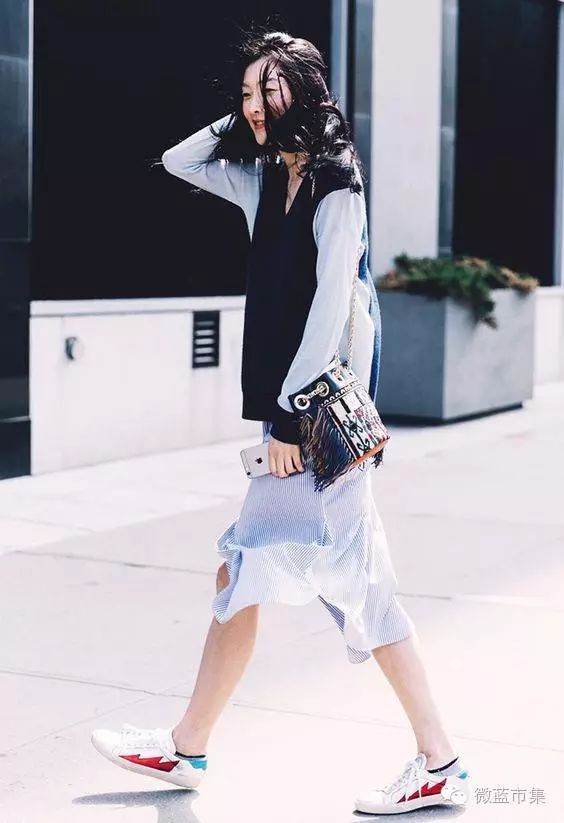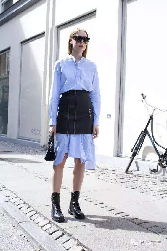 这个穿法简直时髦到爆,关键点要把握的是材质的对比效果,以及衬衫的长度正好要在裙子以下,而且开叉裙是长款衬衫裙的好CP,开叉露出一点衬衫,这种多层次的搭配,帅美帅美哒!