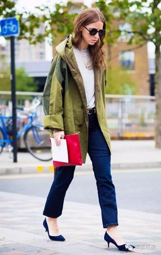 完全是个帅气女孩的打扮!中性的率性潇洒的军绿,作为外套,棉服都是秋冬里最常见的穿着,配饰上可以选择一个精致的红色包包来点亮全身造型。