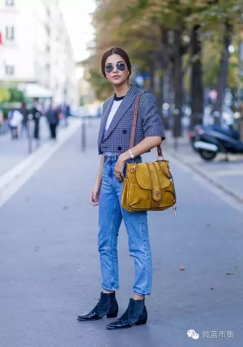 五分袖短版西装外套,搭配复古高腰牛仔裤和麡皮包款。时髦复古的造型,配上丝绒踝靴后,多了一分摩登感。