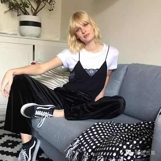 内衣外穿,金丝绒阔腿裤混搭板鞋,酷酷的色调,不同材质的碰撞还真是很好看。