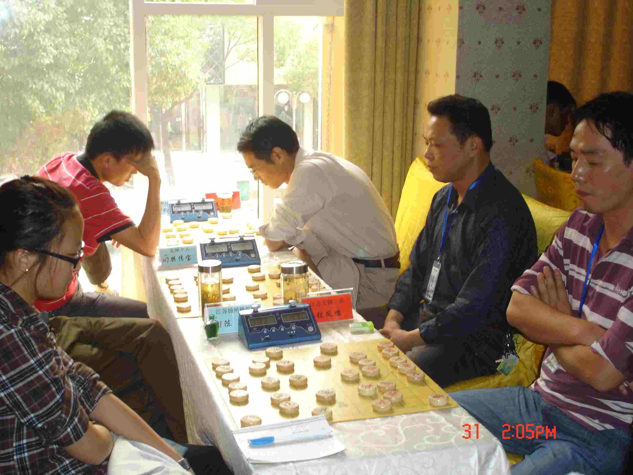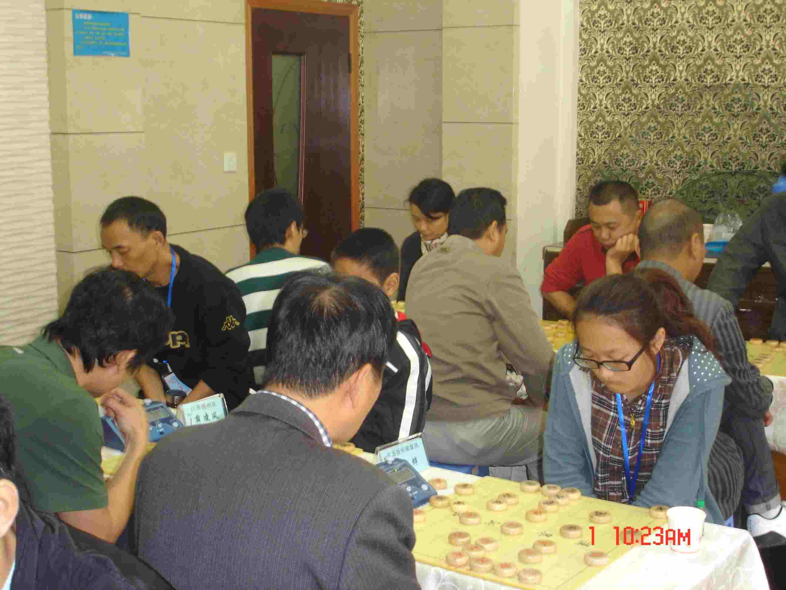 到达赛地后,我们受到了以马鞍山象棋协会会长杨正保先生、裁判长乔勇女士为首的协会工作人员的热情接待,在我们之前已有最远的温州地区乐清市队、苏州队等一部分队已先期抵达,组委会盛情为我们接风洗尘、免费提供了午餐。比赛赛场惠丰美食城即是马鞍山象棋协会所在地,杨会长正是这家美食城的老板,猜想之下杨会长肯定是一位很热心的象棋爱好者,为当地的象棋活动开展和多边交流作了许多力所能及的贡献。此次赛事,又为三省棋友交流提供了一个很好的平台。