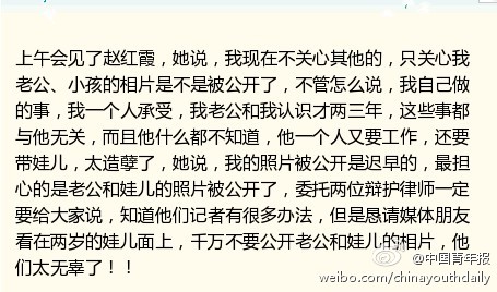 今日,重庆不雅视频当事人赵红霞通过张智勇律师恳请媒体千万不要公开丈夫和孩子的照片。赵红霞说自己做的事一个人承担,小孩和老公都是无辜的。(《中国青年报》02-04)