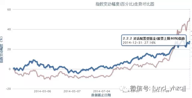 根据中国银河证券基金研究中心的统计,截止2014年12月31日,参与平均计算的灵活配置型基金(股票上限80%)数量75只,2014年平均净值增长率27.96%。