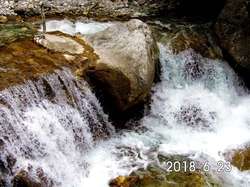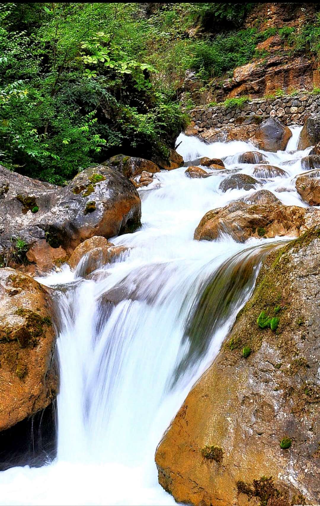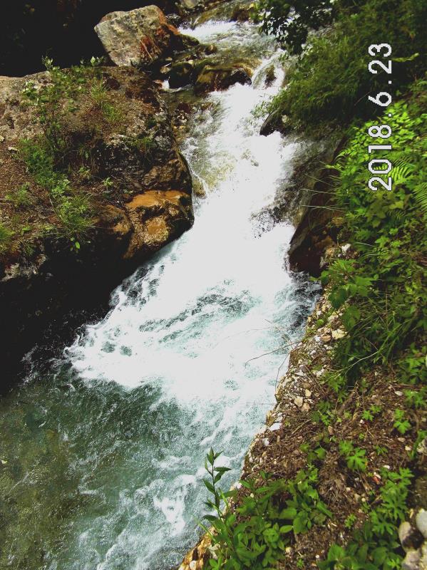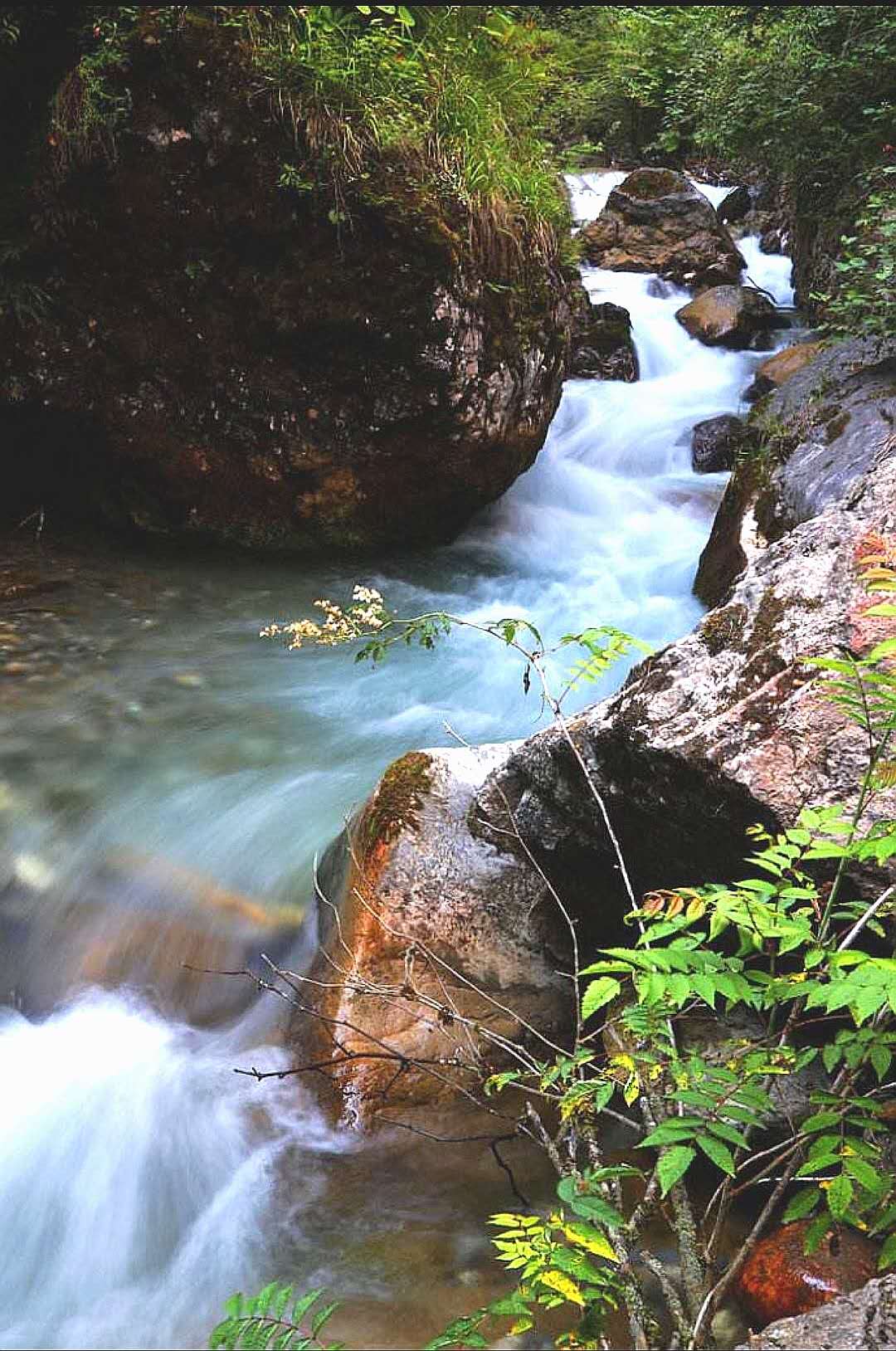 你会看到,官鵝水果然名不虚传,现在仅是初夏,但山沟里的水奔腾向下,绕巨石,拐急弯,发出响亮的声响。