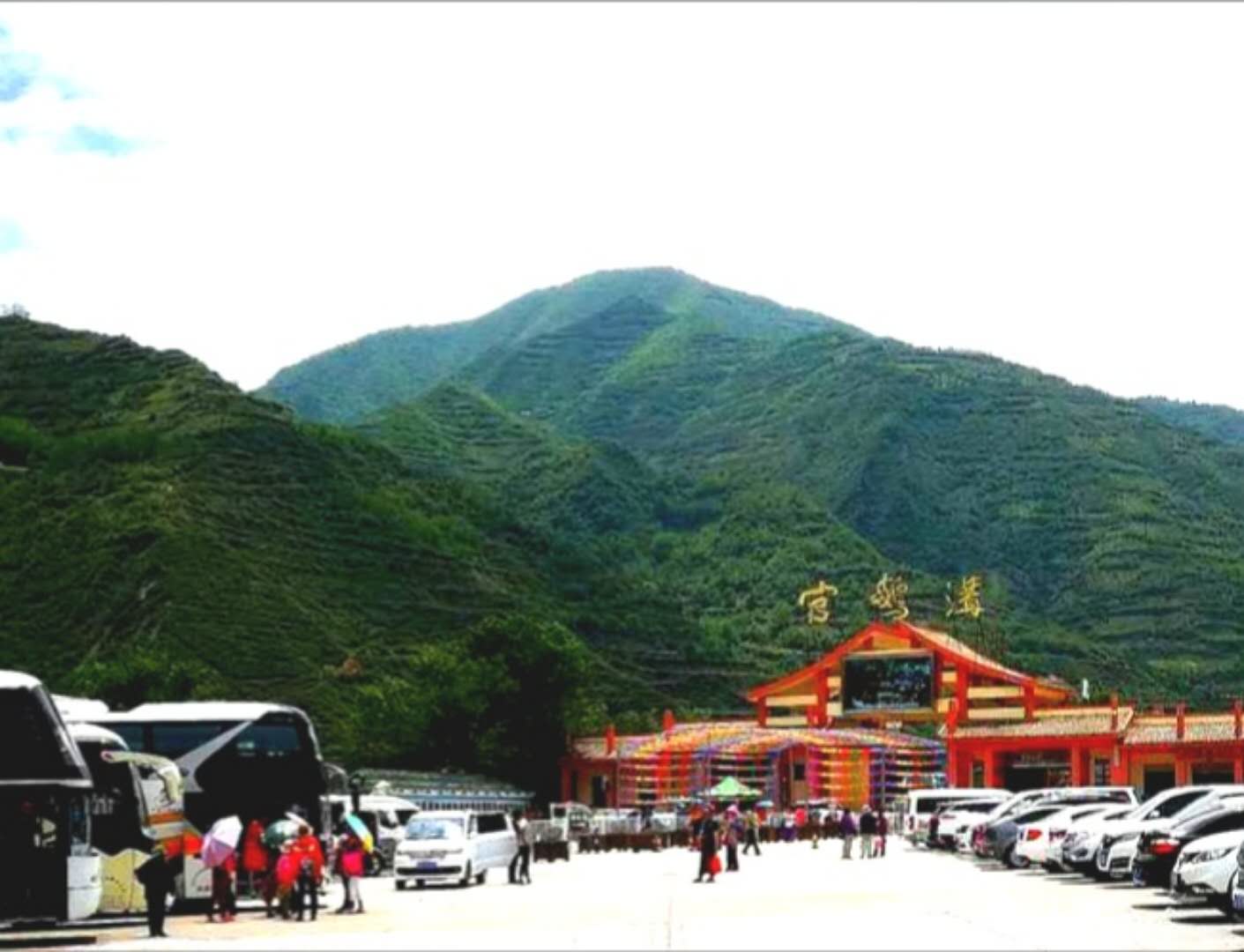 这天,我们如愿来到了这个国家4A级景区,宽敞的停车场里已停满了许多旅游大巴、小车。在黛青色山峦的衬托下,景区门口官鵝沟三个大字格外醒目。